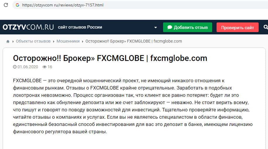 Мнение интернет ресурса отзывком ру о компании финансовых мошенников FXCMGlobe