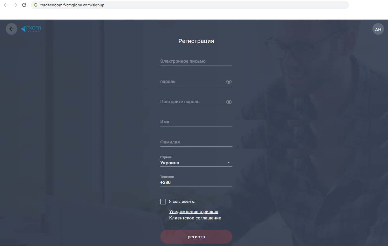 Регистрация в мошенническом проекте FXCMGlobe