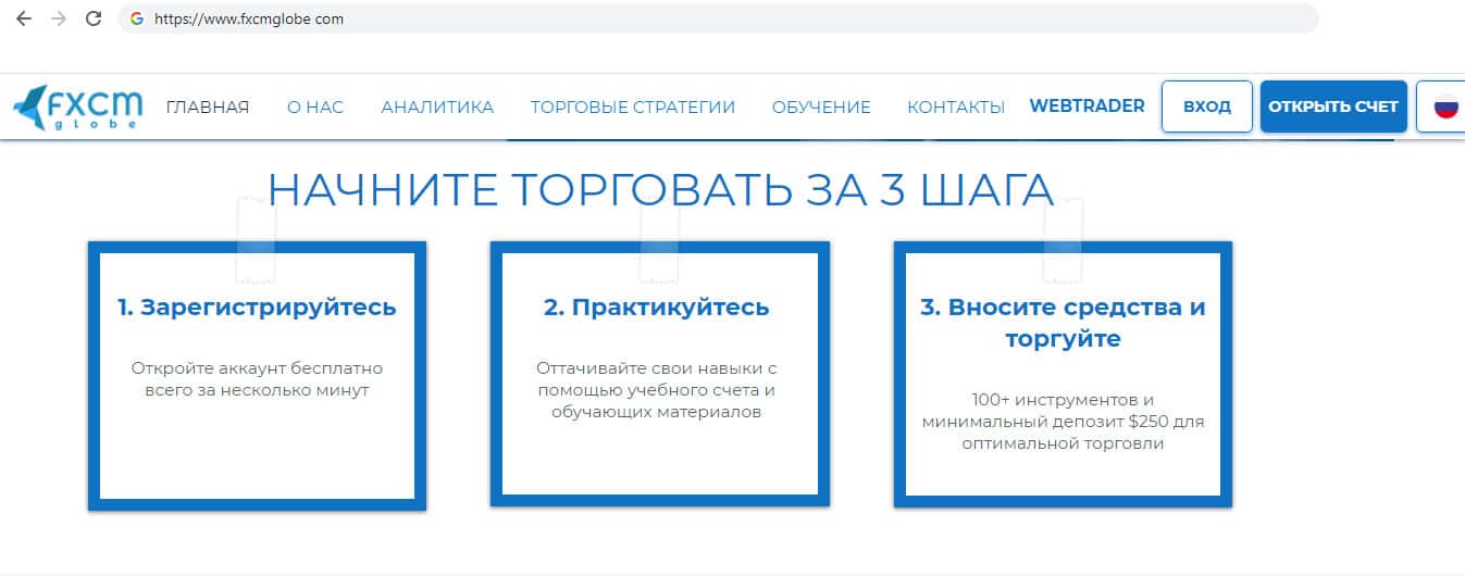 Далее компания продемонстрировала три шага для того что бы якобы начать зарабатывать. Первым шагом является регистрация в лохотроне ФХСМ Глобе, вторым шагом тренировка на учебном счёте, который настроен так, что пользователь будет только зарабатывать. И финальным шагом к банкротству является депозит, минимальная сумма которого составляет 250 долларов.