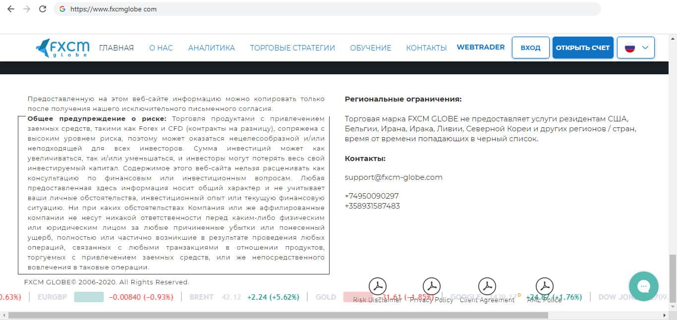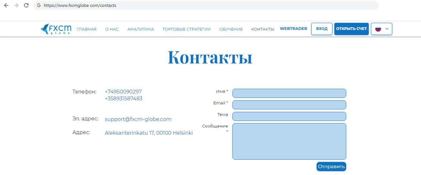 Способы связи с фирмой мошенников FXCMGlobe
