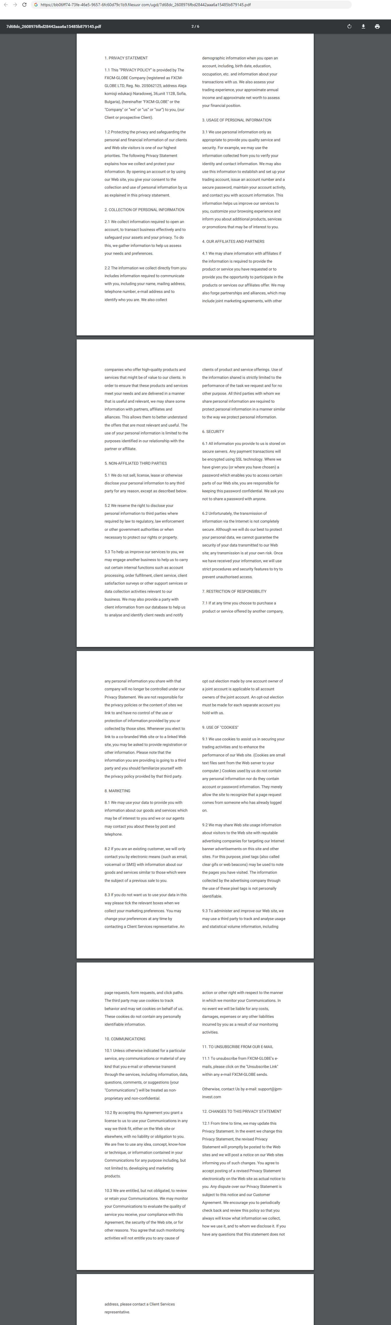 Аферисты ФХСМ Глобе предоставили на своём сайте политику конфиденциальности. Но почему то клиентское соглашение составлено на русском языке, а политика конфиденциальности на английском. Так же документ очень большой, что бы пользователям лень было читать и они просто пролистывали его.