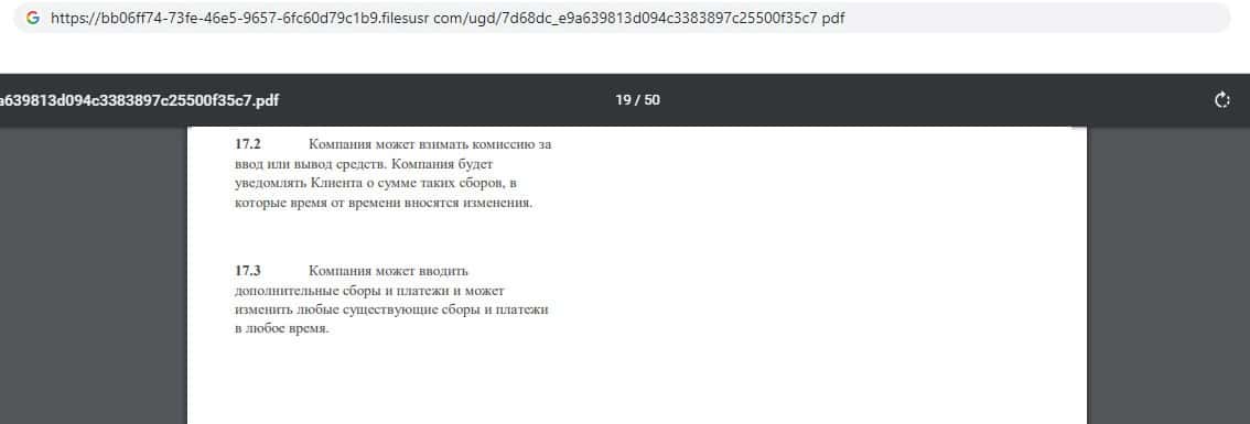 Так же компания указывает, что может брать комиссию за любые действия. Об этом фирма на сайте умалчивает. Но ещё компания может вводить дополнительные сборы, о которых клиент компании не знает, а узнает только тогда, когда у него уже отберут эти деньги. Жулики стараются отобрать все деньги клиента.