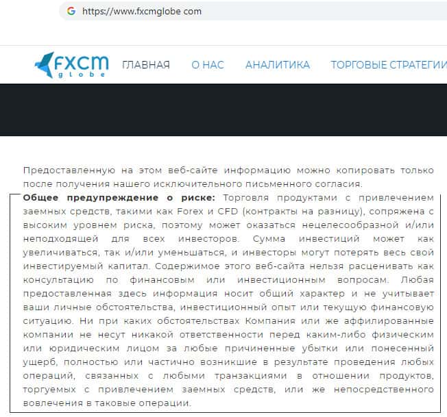 Мошенники FXCMGlobe предоставили предупреждение о рисках