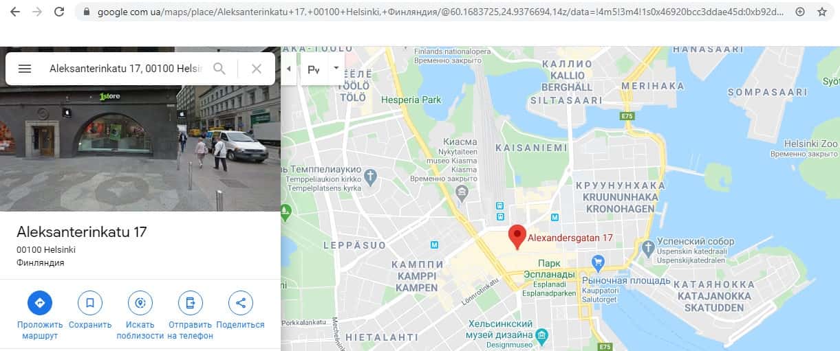 Мы решили проверить и адрес офиса компании, хоть это и так понятно, что офиса не существует. Фирма указала, что главный офис компании находится по адресу: Aleksanterinkatu 17, 00100 Helsinki. Но как мы видим на изображении на указанном адресе находится магазин, но точно не офис фирмы компании мошенников FXCMGlobe.