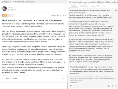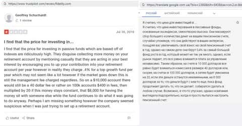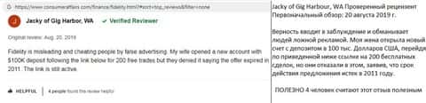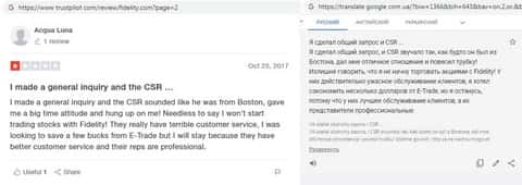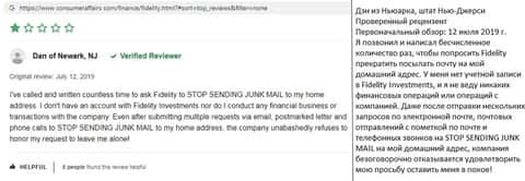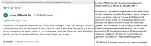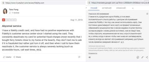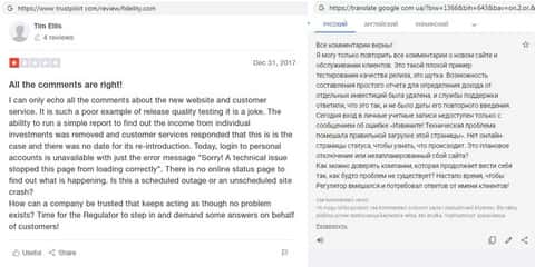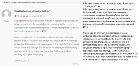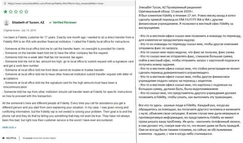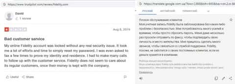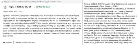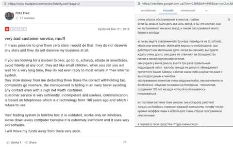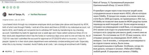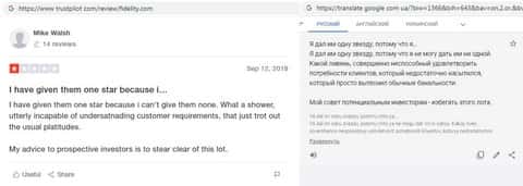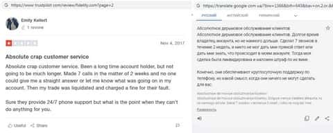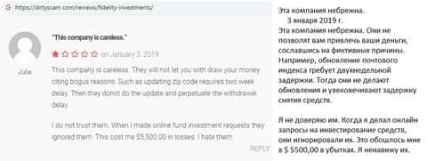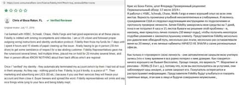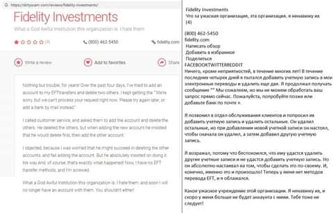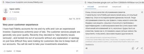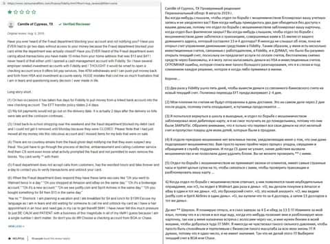 Счет этого клиента, чей отзыв приведен на скриншоте с переводом на русский, был заблокирован махинаторами из Фиделити без всяких разумных причин и объяснений. Мошенники могут творить с аккаунтами своих вкладчиков всё, что захотят, вплоть до обнуления и закрытия.