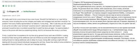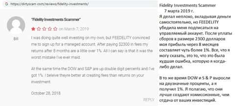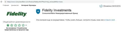 На основании 110 свежих пользовательских отзывов и рецензий, на интернет-ресурсе consumeraffairs com сделали вывод о недобросовестности конторы Fidelity. Заведение имеет низкий рейтинг удовлетворенности и до сих пор не аккредитовано.