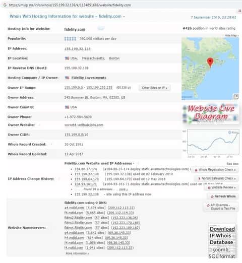 Данные по домену мошеннического портала Fidelity показывают, что контора была создана в 1991 году. В течение многих лет этому жульническому проекту удается разводить и кидать простых людей на деньги, оставаясь при этом безнаказанными. Располагается шарашка в США.