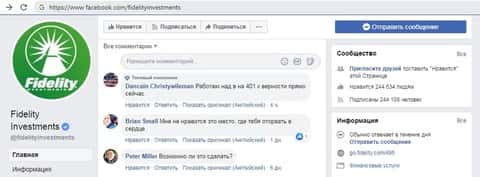 Жульё, подобное Fidelity, идет в ногу со временем. Уловив, что большинство их потенциальных жертв сидит сегодня в разных соцсетях, мошенники поторопились создать и свои страницы. В Facebook у них есть аккаунт, где среди купленных хороших отзывов находим и жалобы кинутых вкладчиков.