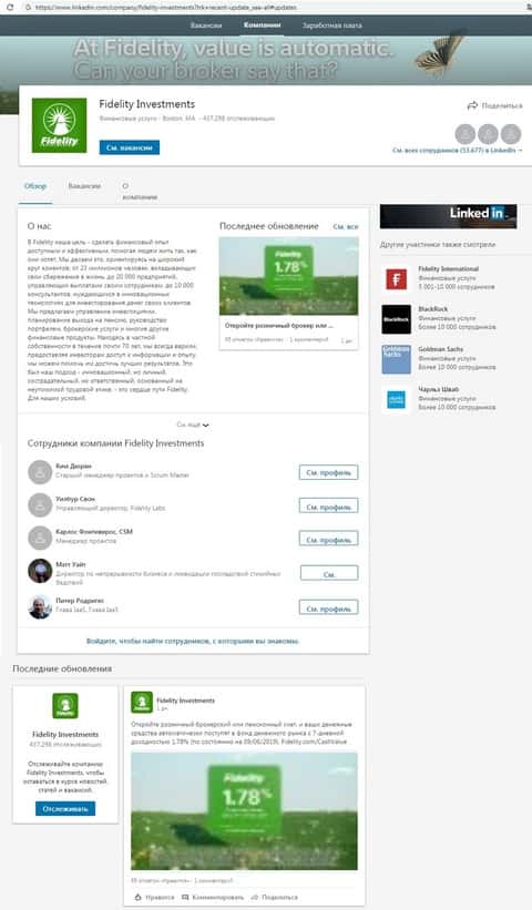 В системе поиска сотрудников и работодателей - популярной сети Линкед ин - аферисты Fidelity тоже не постеснялись разместить свою страницу. Ничего нового на ней нет, информация повторяется одна и та же во всех соцсетях. Бегите подальше от этих скаммеров, они обманом вытягивают деньги пользователей.