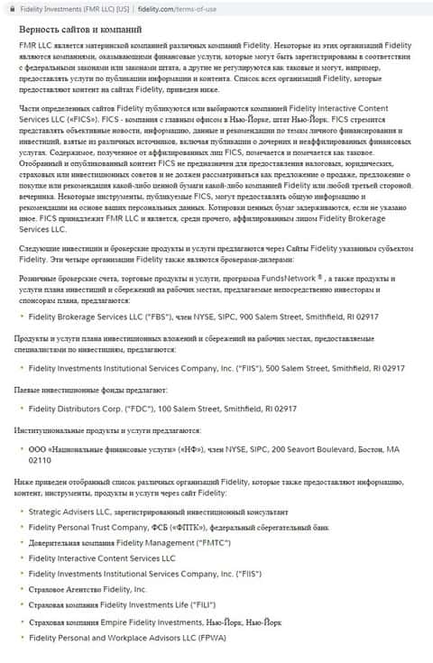Хитрюги и аферисты из конторы Фиделити отлично подстраховались на любой случай. Оказывается Fidelity это сборное название шайки лжецов и обманщиков, в составе около 13 организаций, представляющих свои услуги через сайт Фиделити. Одна из них лицензирована контролирующими органами США.