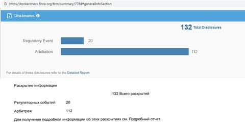 Если пролистнуть сайт регулятора чуть ниже, увидим пункт: раскрытие информации о Фиделити. Брокерские конторы обязаны раскрывать информацию о судах или уголовных делах, в которых они участвовали. Здесь мы видим, что на шарашку не один раз подавали в суд - количество дел равно 112.