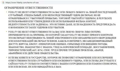 В клиентском соглашении Фиделити мелким шрифтом записаны пункты, которые они хотят скрыть от вкладчиков. Наверняка мошенники отказываются от ответственности, а бедные лохи, заключившие с ними договор, сами дают согласие на слив бабла и блокировку счетов.