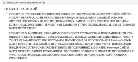 Достаточно прочитать последние страницы скаммерского договора на сайте Fidelity, чтобы понять, что это сброд жуликов и финансовых аферистов. Чтобы подчеркнуть, что они вообще ни причем, и ничего не обещали, мошенники заглавными буквами выделили пункт об отказе от гарантий.
