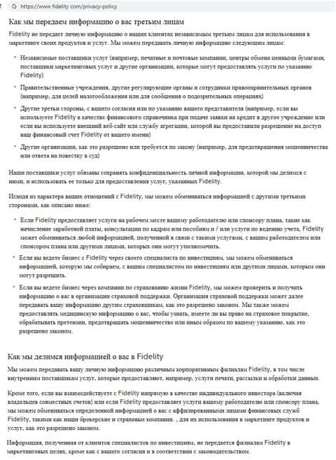 Подобно лживому соглашению Фиделити, их политика конфиденциальности не лучше. В первом же абзаце находим информацию, что политика одинакова не для всех клиентов, а в зависимости от того, имеете ли вы дело с их специалистом, или нет.
