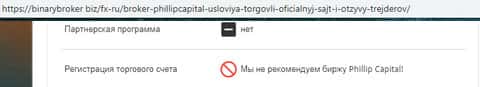 В связи с мошеннической и противозаконной деятельностью лохотрона PhillipCapital, которая не приносит жуликам Филип Капитал никакого успеха, шулера PhillipCapital не пользуются в сети интернет никакой популярностью, однако некоторые порталы все же не рекомендуют иметь дело с лохотроном Филип Капитал, например как портал бинариброкер биз, что вы можете увидеть на изображении ниже.