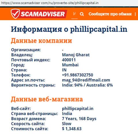 В связи с мошеннической и противозаконной деятельностью аферистов PhillipCapital их реальные руководители предпочитают анонимность дабы избежать ответственности со стороны правоохранительных органов. Информацию о самом же сайте лохотрона Филип Капитал можно узнать с помощью портала scamadviser com, который вы можете увидеть на изображении, расположенном ниже.