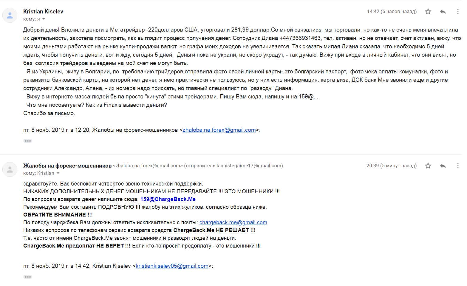 В данной жалобе девушка рассказывает, как её развели сразу же две дилинговые кухни FinAxis и ЮФТ Груп примерно на 7000 долларов. Женщине написали на почту аферисты, и предложили выгодный заработок в интернете. Женщина согласилась, после чего передала свои данные аферистам. Но через некоторое время, жулики перестали выходить на связь.