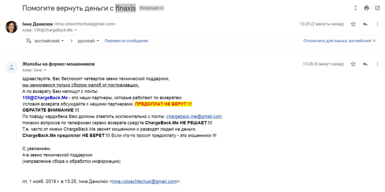 Очередной пострадавший призывает ни каким образом не вестись на лохотрон FinAxis и не просить у них помощи, иначе как помогут, то мало не покажется. Потом у вас возникнут две проблемы - как вернуть деньги от брокера и как забрать предоплату за услугу, которая не была предоставлена. А они кинули уже не мало людей.