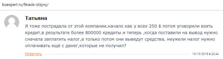 Очередная пострадавшая поделилась своей ситуацией, в которой аферисты FinAxis выманили у нее все деньги, да и еще вдобавок загнали по уши в долги. Мошенники предложили вернуть средства, но для этого нужно было заплатить налог. Теперь она ищет варианты с возвратом вложенных денег без участия этих мошенников.