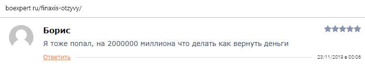 Данный отзыв написал один муж женщины, которая попалась на удочку к аферистам FinAxis. Они не хотели отдавать ей вложенные средства и проценты по ним, якобы она не выполнила определенные условия. Все письма, которые он отсылал мошенникам вообще не были прочитаны.
