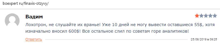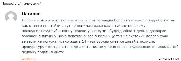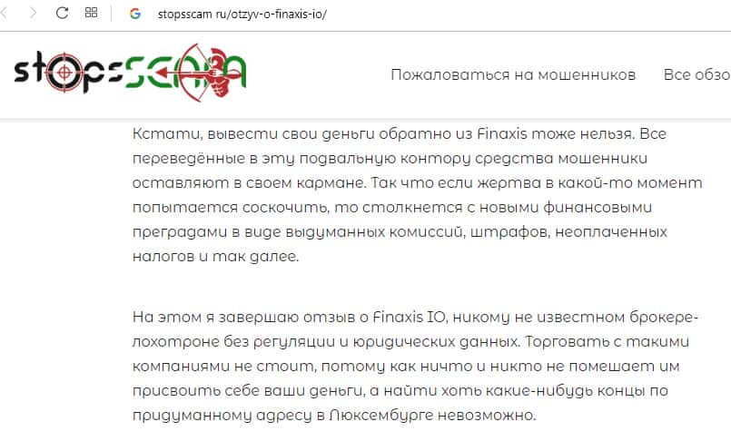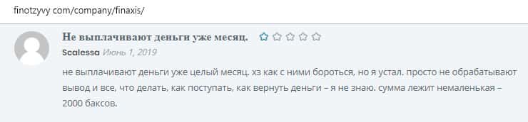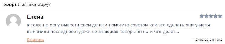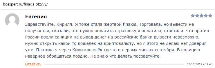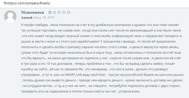 По словам автора следующей статьи, из конторы FinAxis нет вариантов вывести вложенные средства и все переведенные деньги, аферисты оставляют у себя. Так что, если вдруг решили сойти от них, то нужно аккуратно пытаться вернуть свои вложения, иначе они просто заблокируют счет и поставят ваши контакты в игнор.