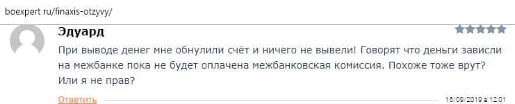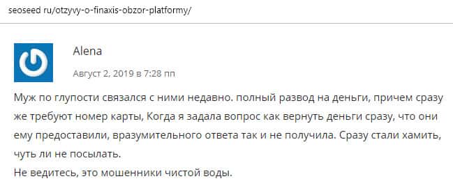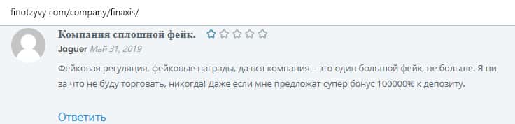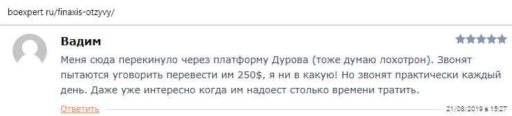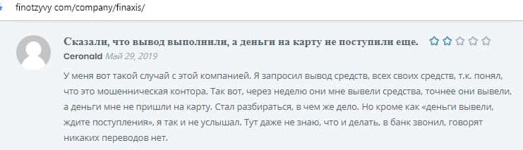 По мнению интернет-пользователя жулики FinAxis накрутили себе специально репутацию, через платные ресурсы. При чем весь позитив сложен на основе шаблонных текстов. Мало того, аферисты постоянно переводят стрелки на платежные системы и в данном случае они говорят, что перевели деньги, хотя банк-эмитент карты клиента отрицает это.