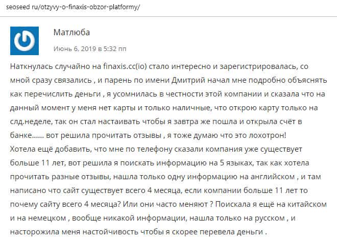 Еще один человек рассказал вкратце, как работает контора FinAxis и вообще, что она из себя представляет. По ее мнению, данная кухня находится на рынке намного меньше, чем они указывают. Обычный пиар вбивает в умы интернет-пользователей, что это якобы надежная компания с многолетней историей, хотя на самом деле это обычный фейк.