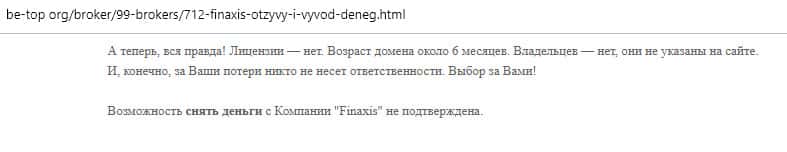 Из заключения следующей статьи касательно мошеннической кухни Фин Аксис, у них нет лицензии на ведение деятельности, домену всего-то 6 месяцев, владельцев нет и конечно же лохотронщики не несут никакую ответственность. В добавок ко всему, факта снятия денег каким-либо клиентом не подтверждена.