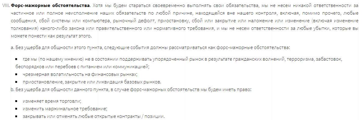 В своем договоре, лохотрон FinAxis пытается донести клиенту, что в большинстве случаях, в которых он потерпит убытков или в других неприятных ситуациях, они будут ссылаться на форс-мажорные обстоятельства. В суде вы не сможете ничего доказать, а лишь потратите деньги и время. Поэтому рекомендуем не подписывать это соглашение.