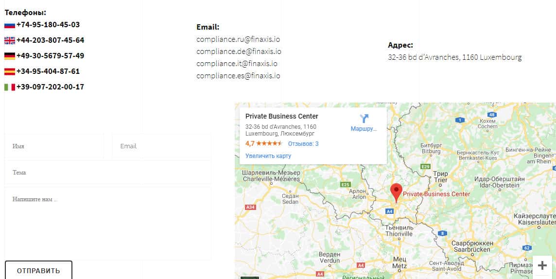 Для связи с собой, мошенническая контора FinAxis использует различные контактные данные, при чем они пытаются приспособиться к каждой потенциальной жертве вне зависимости от их языка. Но мы уверены, что когда вы переведете им первую денежку, то на связь они больше не выйдут. А вот собственно и их данные: