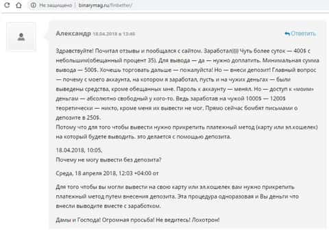 Доказательством надувательства может послужить следующее письмо от одного из вкладчиков в эту финансовую пирамиду. А надурили его псевдоброкеры из FinBetter по своей уже отработанной схеме, не дав вывести ни копейки со счета.