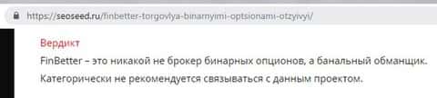 Обратите внимание, какой вердикт был вынесен платформой по розыску и разоблачению нечестных брокеров в сети seoseed ru. На основании множества негативных отзывов, FinBetter признан не компанией по торговле бинарными опционами, как это заявлено самими мошенниками, а банальным обманщиком, с которым ни в коем случае нельзя связываться, если Вы не хотите потерять свои деньги.На что соглашается клиент FinBetter, подписывая договор с мошенниками
