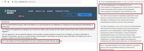 Во-первых, как и все лохотронщики, работающие под видом брокеров, Фин Беттер не забыл включить в договор пункт о полном отсутствии ответственности со своей стороны перед клиентом или любой другой третьей стороной. Ни Ваши убытки, ни упущенная Вами выгода, как сказано в этом фальшивом соглашении, не лягут на плечи жуликов из FinBetter.