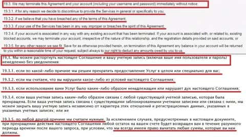И, наконец, знаменитый пункт 19.3, который звучит, как окончательный приговор болвану, связавшемуся с преступным торговцем бинарными опционами Фин Беттер: данное соглашение, вместе с учетной записью пользователя, может быть расторгнуто даже без его ведома. Причины? Причины перечисляются далее, они могут быть любыми, какие придумает себе компания. Они так и говорят: по любой причине, которую мы считаем нужной. Да, и не забудьте, что они имеют право вычитать любые суммы со счета клиента. Мы настоятельно советуем не иметь дел с FinBetter, и не подписывать с ними мошенническое соглашение.