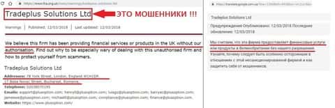 Что касается самой компании Tradeplus Solutions Ltd, это очередная подстава мошенников. Выявлено, что контора никем не регулируется, а, значит, вся ее брокерская деятельность – это развод пользователей на деньги исключительно из целей своей наживы. Не иметь дел с этими проходимцами настоятельно рекомендует официальный британский финансовый регулятор FCA (Financial Conduct Authority) на своем портале. Кстати, обратите внимание на 2 адреса Tradeplus Solutions Ltd, отличных от того, который был приведен на сайте FinBetter.