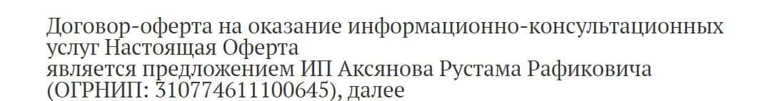 Юридическим лицом компании Фин Грам является ИП Аксянов Рустам Рафикович. Информация об этом дана в клиентском соглашении.