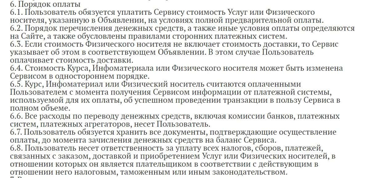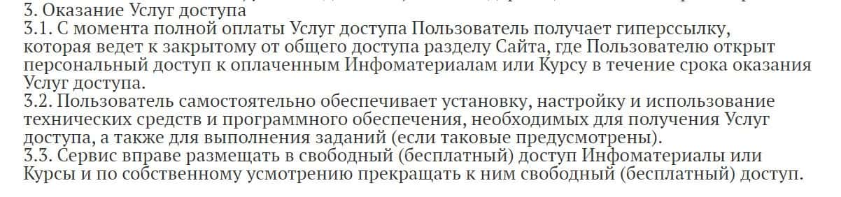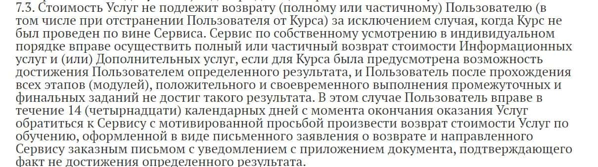 Пункт 7.3 уведомляет клиента, что денежные средства, уплаченные за курс, возврату не подлежат.