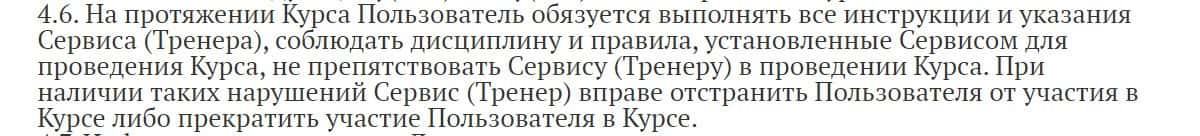 В пункте 4.6 говорится о том, что компания Fingram Pro вправе отстранить клиента от участия в курсах, если тот нарушит условия договора.
