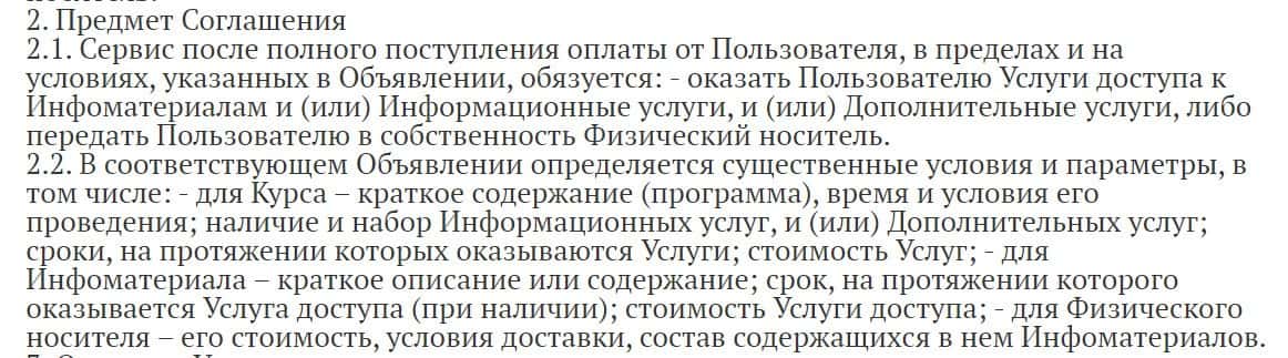 В разделе 2 своего соглашения компания Fingram Pro пишет, что предметом договора является предоставление информации пользователю за определенную плату.