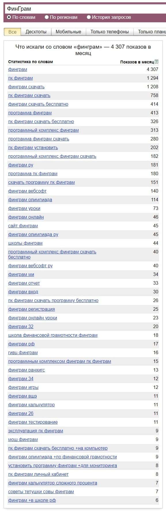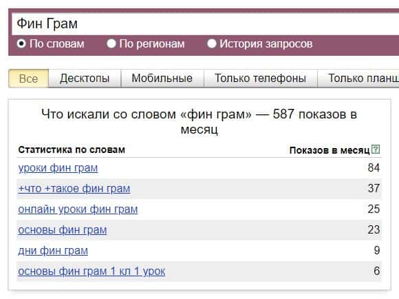 То же название, но написанное с пробелом "Фин Грам" на русском языке, люди пытались найти в системе Яндекс 587 раз.