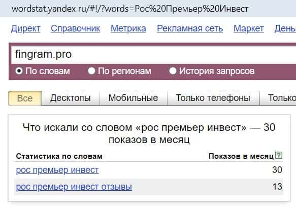 В поисковой системе Яндекс сайт школы финансовой грамотности "fingram.pro", вбитый в строку с точкой, пользователи искали 30 раз за месяц.