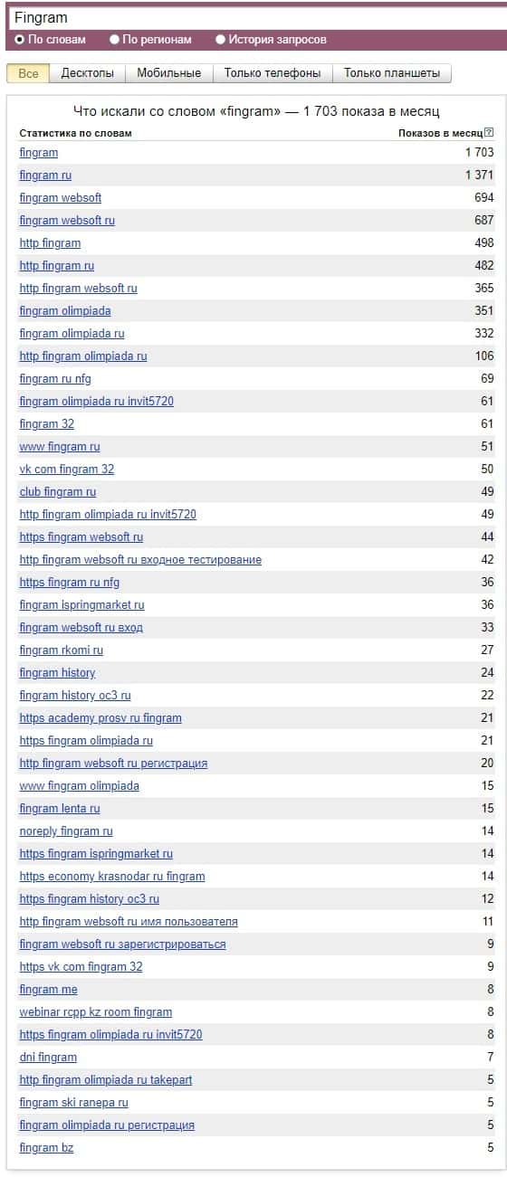 Название бренда на русском языке без пробела "ФинГрам", пользователи искали в системе Яндекс 4307 раз.