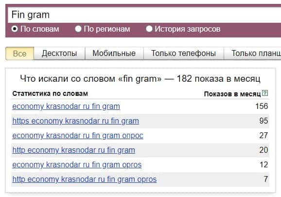 Посмотрим, сколько раз пользователи вбивали в поисковую строку название компании "Fin gram"на английском языке с пробелом. Результат такой: 182 показа.