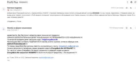 О том, что Fin Consult является одним целым с другим мошенническим дилинговым центром ProfitPlus рассказала вкладчица, которую без зазрения совести кинули на 35 штук рублей. В последней надежде вернуть хоть что-то женщина написала в ChargeBack.Me развернутую жалобу.