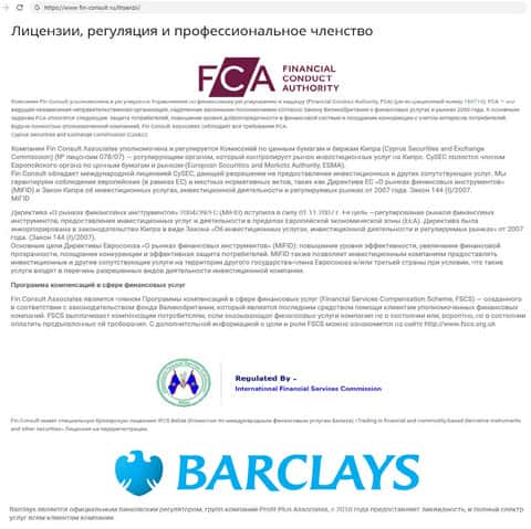 В разделе лицензий жулики Фин Консулт постарались на славу – они, не стыдясь, запросто приписали себе номера чужих лицензий. Это просто смешно, и разрешение из Кипра у них есть, и из Великобритании, и из Белиза, ну чтобы уже наверняка замылить глаза очередному лохушнику-клиенту.