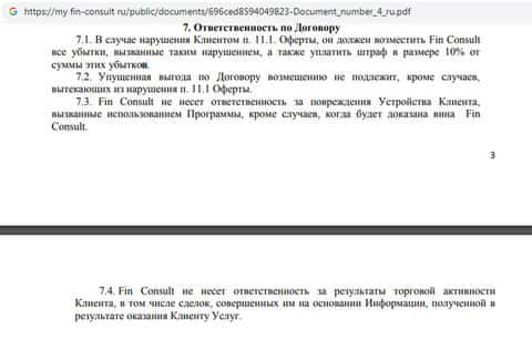 Дальнейшие пункты ожидаемы – никакой ответственности у шараги Fin Consult за любые потери клиента. Во всем виноват будет сам трейдер, члены же шарашкиной конторы освобождают себя от ответа за содеянное, да еще и требуют уплаты штрафа, если вдруг обнаружится, что клиент что-нибудь нарушил.