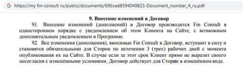 Аферисты Fin Consult не забыли прописать в соглашении, что они вправе менять любые пункты. При этом клиент как бы уведомляется автоматически, после публикации нового документа сайте. Если же он об этом не знает – его проблемы, так как мошенники специально ни о чем не сообщают.