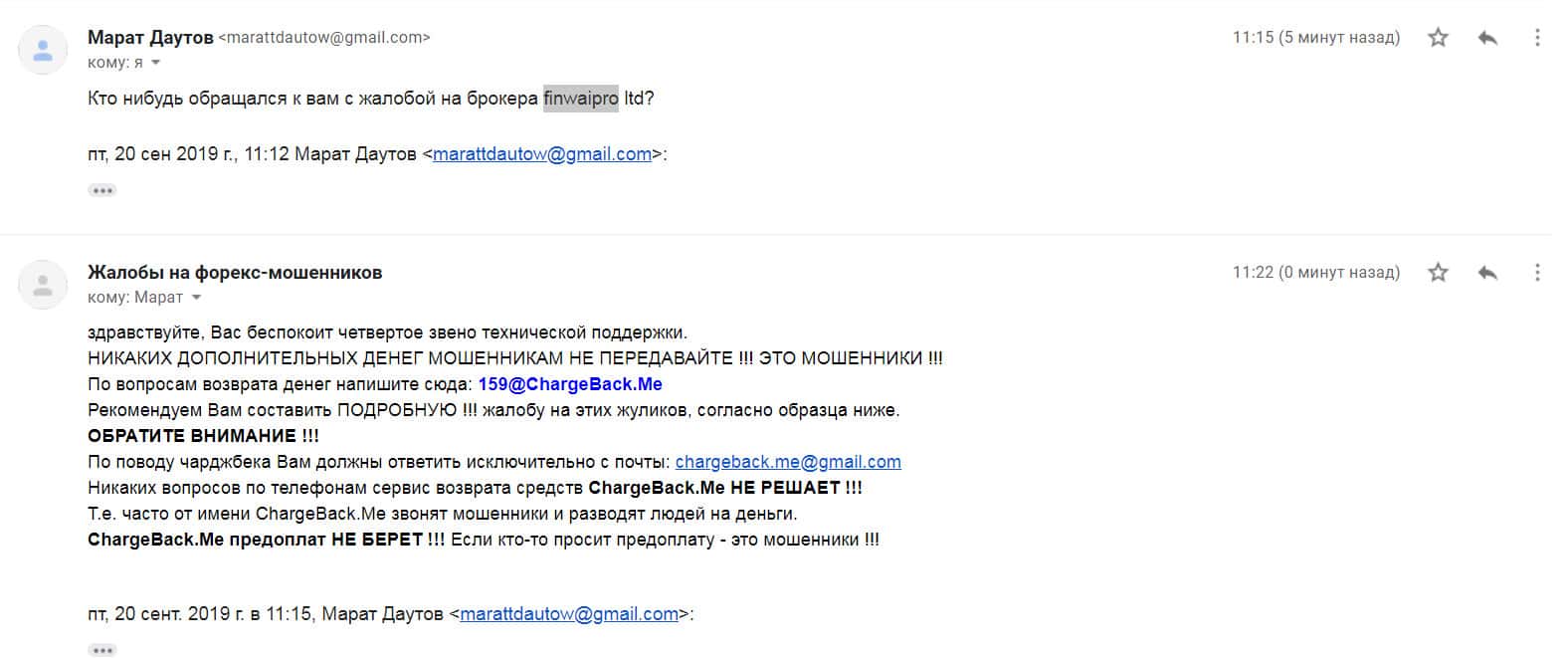 Далее предоставлена очередная жалоба на жуликов из брокерской конторы Фин Вэй Про. Парню написали на почту и предложили поторговать на торговой площадке, клиент согласился и сразу зарегистрировался. Через некоторое время, мошенники начали требовать больше вложений, на что пострадавший ответил отрицательно, и теперь шулеры не выходят на связь.