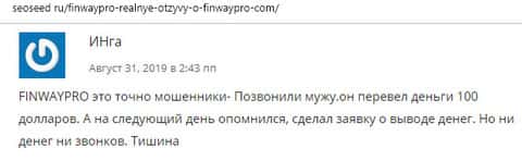 В данном отзыве женщина рассказывает, как она и ее муж попались на уловки мошенников FinWayPro и вложили порядка 100 долларов. Когда они поняли, что зря вложили деньги, решили таки вывести все обратно. В ответ они получили молчание в технической поддержке и все деньги остались до сих пор в шараге Фин Вэй Про.