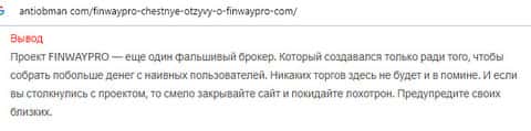 Еще одну статью нам удалось найти, где полностью разобрали деятельность форекс-кухни FinWayPro, так как есть большие опасения, что все кто связались с этими жуликами - больше не получат деньги. К сожалению эта информация подтвердилась и FinWayPro - это еще один фальшивый брокер, который кидает людей.